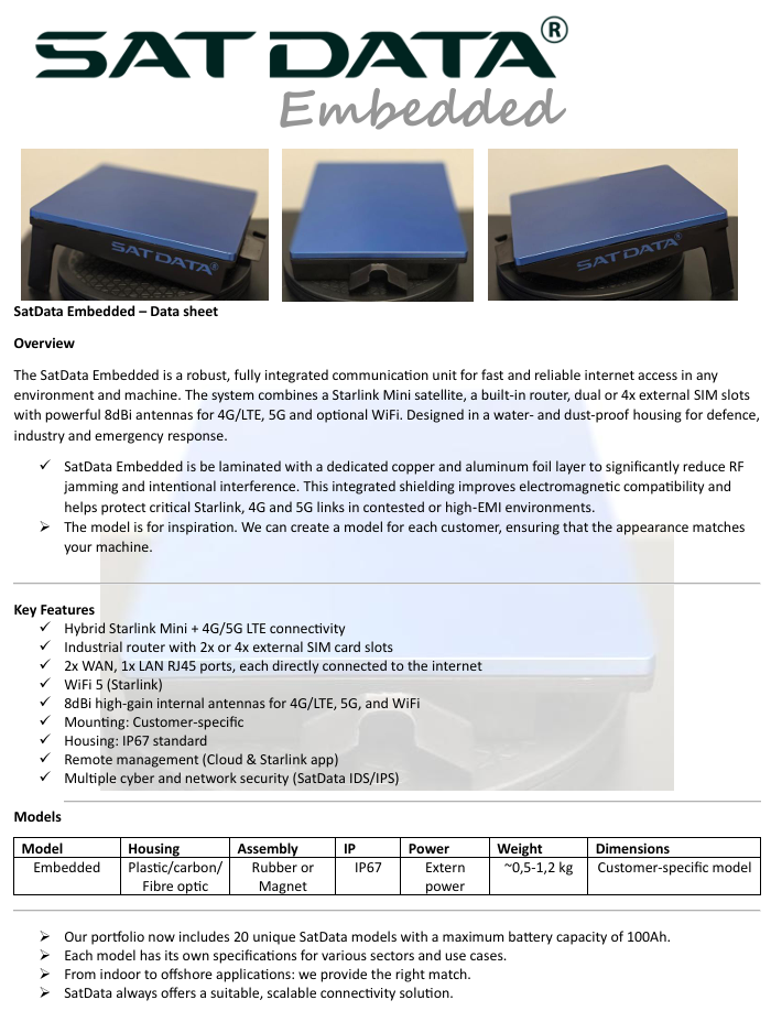 SatData Embedded is ontworpen voor OEM’s, systeemintegrators en fabrikanten die betrouwbare 4G/5G- en/of satellietconnectiviteit rechtstreeks in hun eigen apparatuur willen integreren, zonder concessies aan prestaties of beveiliging. Door de compacte klant specifieke vormfactor, efficiënte energiehuishouding en ondersteuning voor veilige VPN-verbindingen is SatData Embedded ideaal voor industriële IoT-oplossingen, remote monitoring, slimme sensoren en mission-critical toepassingen.