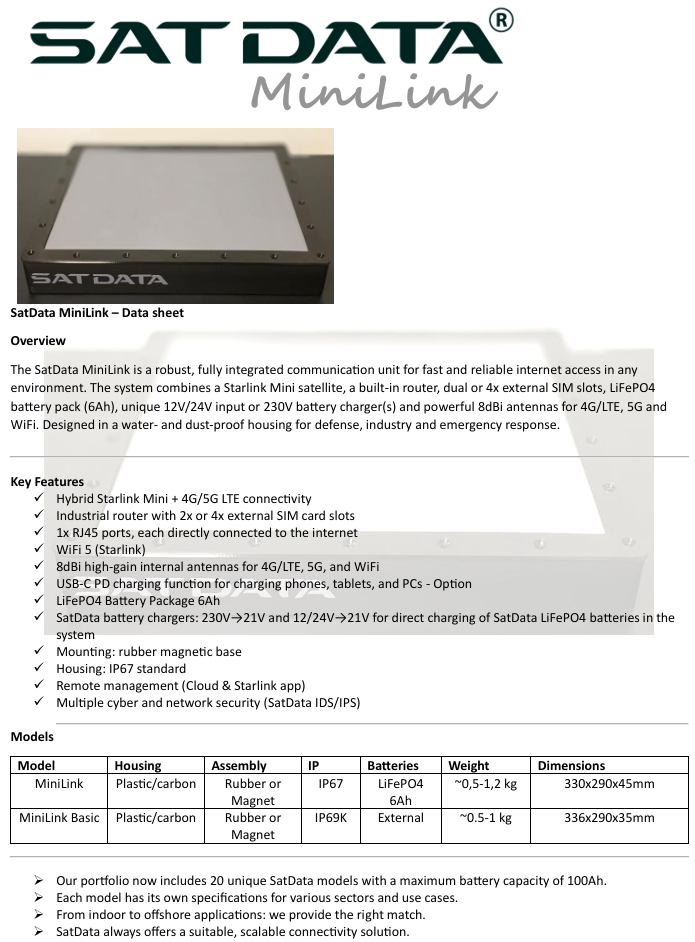 SatData biedt direct en betrouwbaar mobiel internet via 4G, ook in noodsituaties. De compacte en robuuste unit is binnen enkele seconden operationeel en werkt volledig zelfstandig – zelfs zonder stroomvoorziening.
