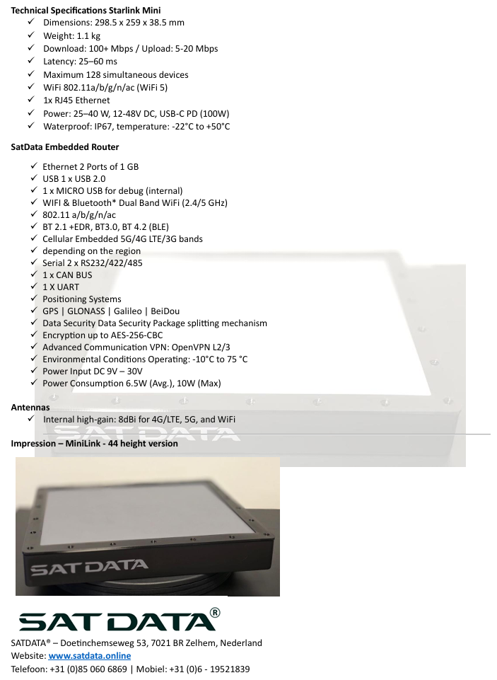Bij SatData® geloven we dat een snelle en stabiele internetverbinding geen locatiegrens mag kennen. Daarom leveren wij innovatieve mobiele internetoplossingen die satellietinternet (zoals Starlink) combineren met krachtige 5G mobiele data, verpakt in een mobiele, draagbare en robuuste unit.